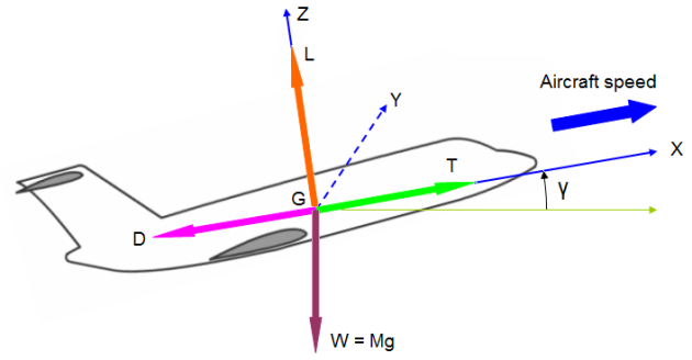 For the study of performances, we consider the aircraft in a straight and level flight. The Velocity Vector is in the symmetry plane of the aircraft and the thrust is parallel to the velocity. Generally, we assume that the air is not moving with respect to the ground.