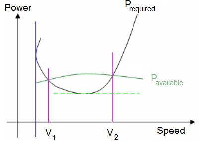 The flight of propeller planes is in the subsonic region. We use the power diagram; the polar curve does not depend on the Mach number. On the power diagram, the available power curve (P available) and the required power curve (P required) intersect at two different places. A level flight can be achieved at two different speeds. The flight at speed V1 is known as the first phase, the flight at speed V2 is known as the second phase.
