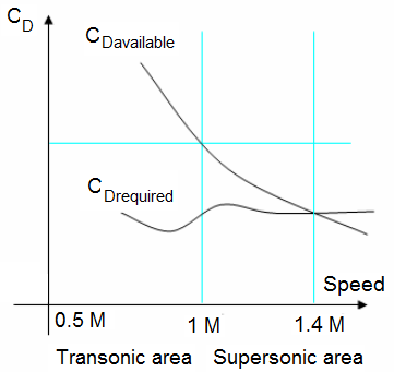 Consider the graph of CD in transonic flight. The gradient of the CD curve changes rapidly before reaching the speed of Mach 1. The shape of the curve determines the Mach number of the level flight, there must be a great increae in thrust in order to change the speed.