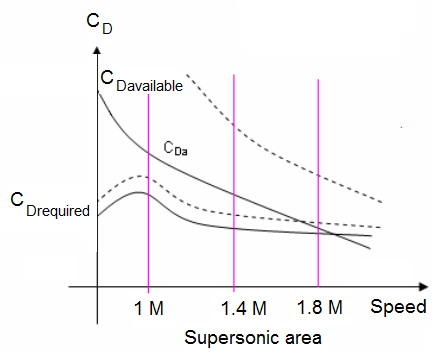 For a level flight at supersonic speed, the aerodynamic characteristics are very significant. Any increase in CD is harmful. A continuous thrust is necessary, and generally the afterburner is used.
