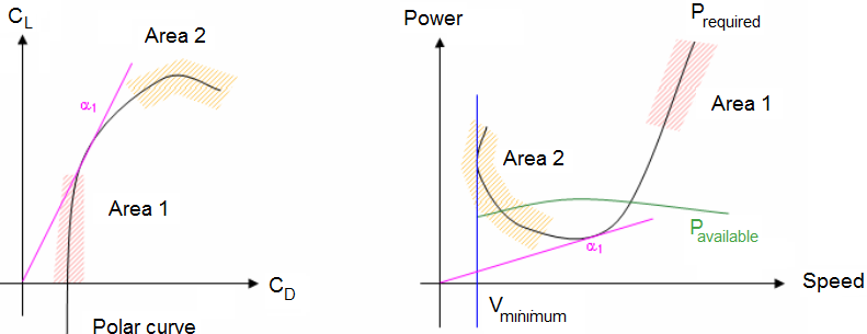 To obtain a safe flight, it is necessary to provide a minimum engine power. A flight with the minimum capacity is carried out at a higher speed than the minimum speed. A flight with the minimum engine power must be achieved with minimum drag. The polar curve gives an angle of attack which requires a faster speed. During the flight with minimum engine power, if speed increases, the plane slows down; we observe the same thing if speed decreases, the plane slows down.