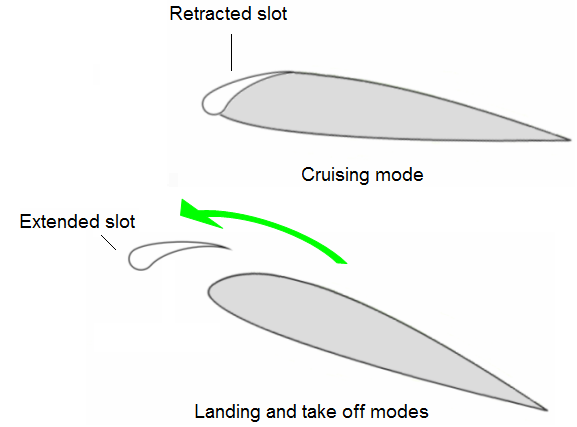 The prevention of the separation of the boundary layer is achieved by the presence of a slot between the fixed part of the wing and the leading edge of the flap causing an acceleration of the airflows.