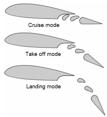 The increase in wing surface area S is primarily obtained by the deployment of moveable surfaces at the leading edge and trailing edge of the wing. Some experiments were carried out on sliding wings with a variable span according to the desired flight phases, but these ideas were often abandoned.