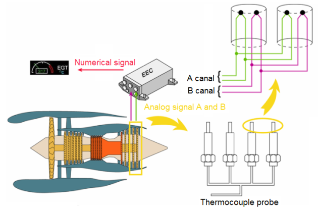 On modern engines equipped with an electronic engine controller (EEC or ECU), the EGT probes may have two thermocouples, one for each channel of the calculator; or a total of eight EGT probes, with a distribution of four probes for each channel of the calculator.