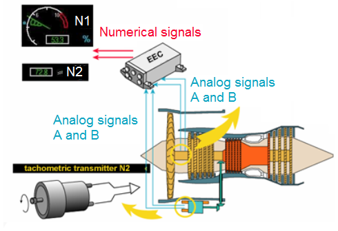 The speed signal can come from a small tachometric generator driven by the AGB (Accessory Gear Box), or from a phonic wheel sensor located on the AGB. In both cases, two analogue signals are available; as for N1, they are digitized by the calculator (ECU or EEC) before being used by the display system (ECAM or EICAS).