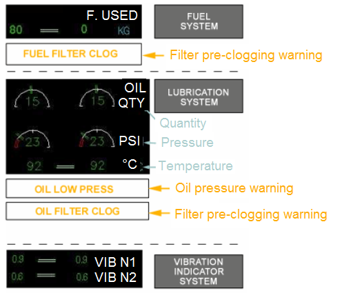 For the EPR, the oil pressure, oil low pressure warning, fuel filter clogging warning and the fuel pressure.