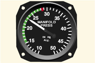 The manifold pressure gauge is color-coded to indicate the engine's operating range. The face of the manifold pressure gauge contains a green arc to show the normal operating range, and a red radial line to indicate the upper limit of manifold pressure.