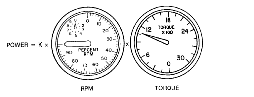 The actual horsepower at a given torque indication must be related to the effect of RPM. The formula illustrated in previos figure indicates that horsepower is a function of a mathematical constant (K) multiplied by the RPM and then by torque indication in foot-pounds. The K factor is a constant factor that does not change (K = 2π / 33,000)