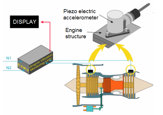 The sensors used on current engines are accelerometers made up of a piezoelectric crystal; a signal of electric charge, proportional to the forces applied by vibrations is generated and sent to the engine vibration monitoring unit (EVMU).