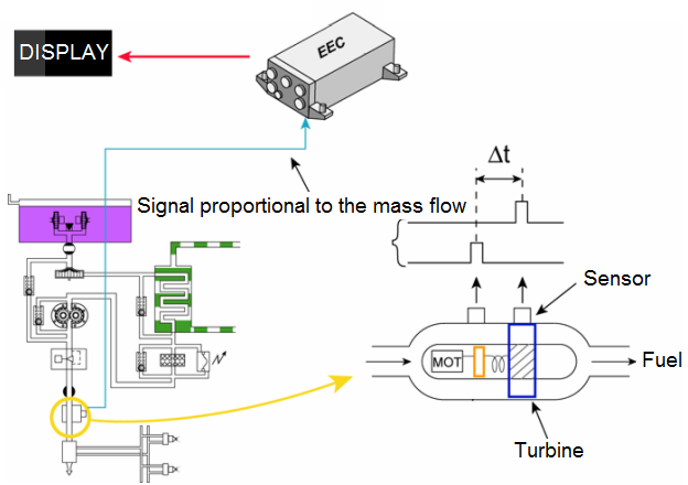 In both cases, the signal is sent to the calculator; the EEC (or ECU) calculates the mass flow rate (expressed in Lbs/h or Kg/h) and passes it on to the ECAM or EICAS system for display. This same data is used to calculate the overall consumption (used fuel).